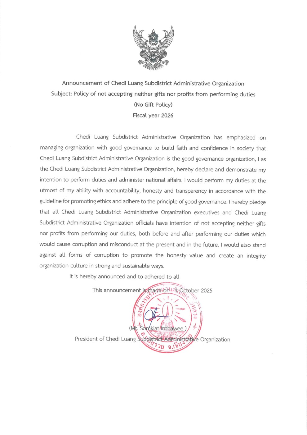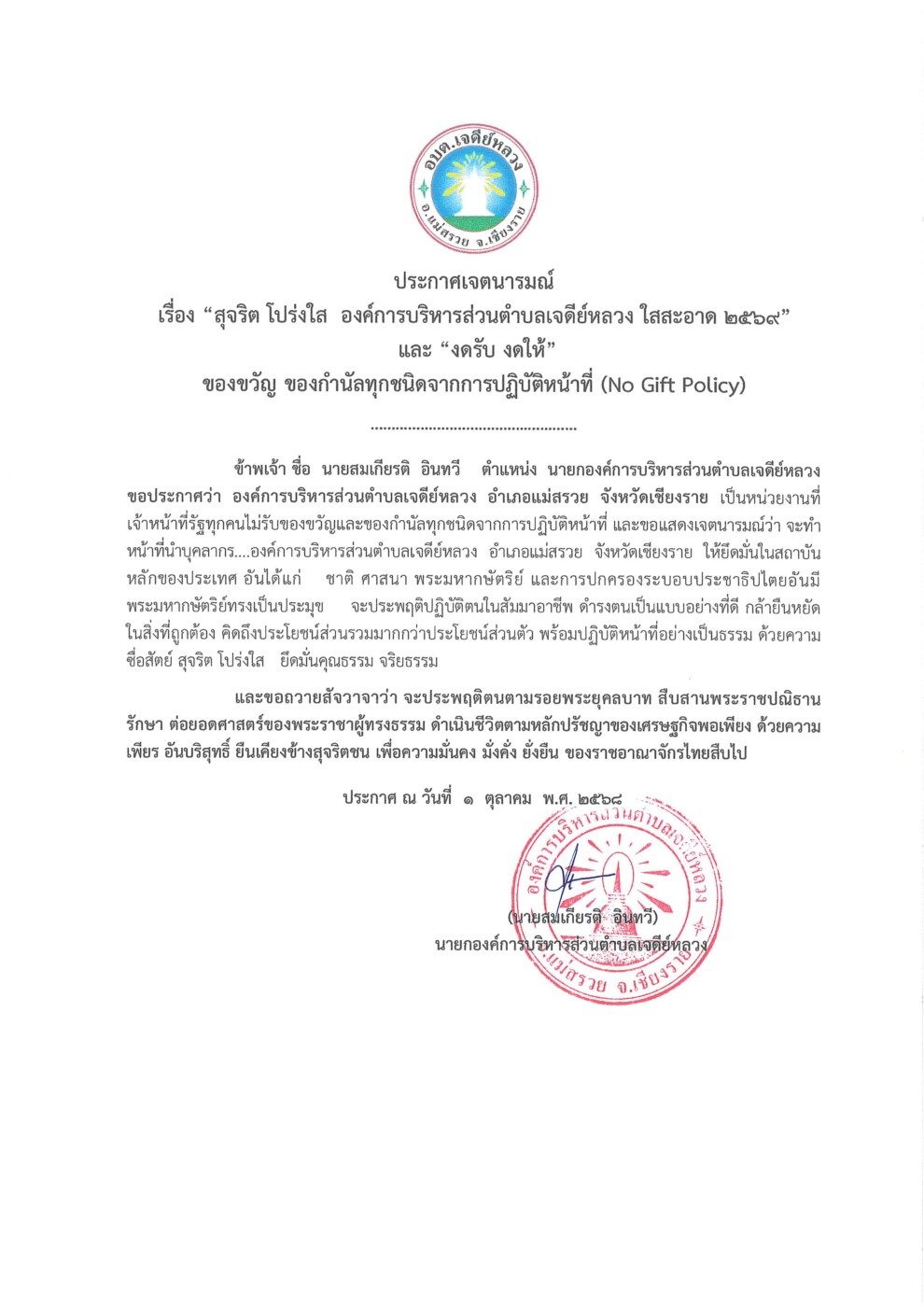 ประกาศนโยบาย No Gift Policy 2569 Post published:2 ตุลาคม 2025 Post category:การสร้างวัฒนธรรมองค์กร / ข่าวประชาสัมพันธ์ แชร์เลย : You Might Also Like ประกาศผลการเลือกสรรบุคคลเพื่อบรรจุเป็นพนักงานจ้าง ตำแหน่งพนักงานขับเครื่องจักรกลขนาดเบา 30 พฤศจิกายน 2023 ระเบียบสำนักนายกรัฐมนตรี ว่าด้วยการให้หรือรับของขวัญของเจ้าหน้าที่ของรัฐ 30 เมษายน 2024 คำสั่งองค์การบริหารส่วนตำบลเจดีย์หลวง แต่งตั้งคณะกรรมการบริหารกิจการและบำรุงรักษาระบบประปาหมู่บ้าน บ้านร้องบง ม.2 21 กันยายน 2023 การลดการใช้ถุงพลาสติก 15 พฤษภาคม 2024