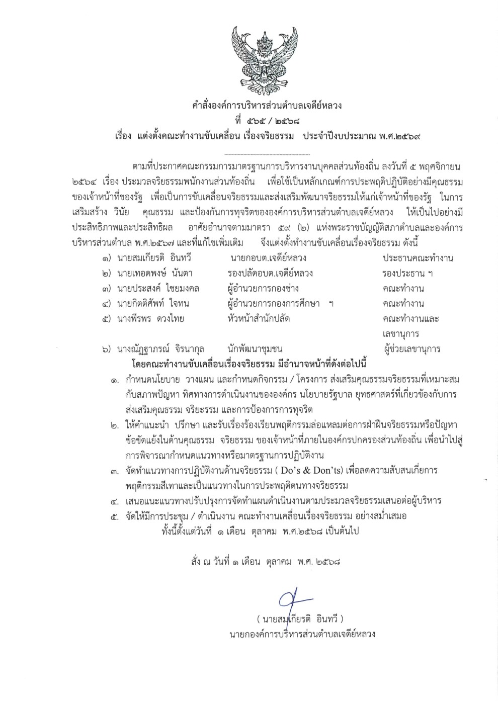 คำสั่งองค์การบริหารส่วนตำบลเจดีย์หลวง แต่งตั้งคณะกรรมการบริหารกิจการและบำรุงรักษาระบบประปาหมู่บ้าน บ้านร้องบง ม.2 21 กันยายน 2023