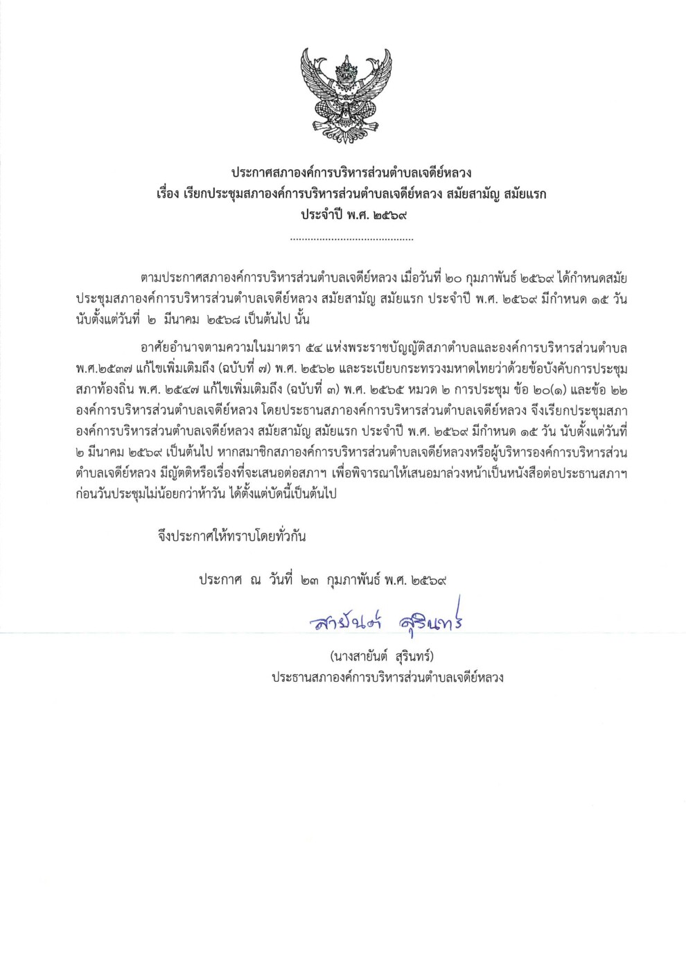 ประกาศสภา อบต. เจดีย์หลวง เรื่อง เรียกประชุมสภาองค์การบริหารส่วนตำบลเจดีย์หลวง สมัยสามัญ สมัยแรก ประจำปี พ.ศ. 2569
