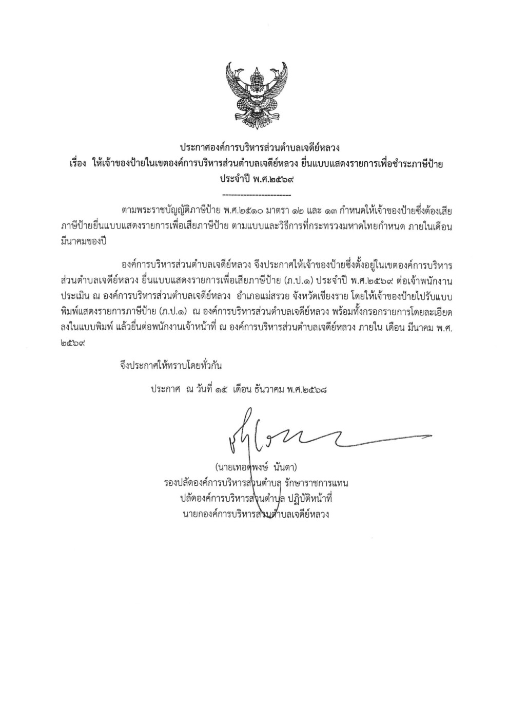ประกาศ อบต.เจดีย์หลวง ให้เจ้าของป้ายในเขต อบต.เจดีย์หลวง ยื่นแบบแสดงรายการเพื่อชำระภาษีป้าย ประจำปี พ.ศ.2569 Post published:15 ธันวาคม 2025 Post category:ข่าวประชาสัมพันธ์ ประกาศ อบต.เจดีย์หลวง ให้เจ้าของป้ายในเขต อบต.เจดีย์หลวง ยื่นแบบแสดงรายการเพื่อชำระภาษีป้าย ประจำปี พ.ศ.2569 แชร์เลย : You Might Also Like บัญชีรายชื่อผู้มีสิทธิรับเงินเบี้ยยังชีพผู้สูงอายุ ขององค์การบริหารส่วนตำบลเจดีย์หลวง อำเภอแม่สรวย จังหวัดเชียงราย 25 พฤศจิกายน 2024 ฐานข้อมูลผู้สูงอายุองค์การบริหารส่วนตำบลเจดีย์หลวง 30 กันยายน 2023 ประกาศเตรียมความพร้อมมวลอากาศเย็นในระหว่างวันที่ 20-25 ธันวาคม 2566 21 ธันวาคม 2023 ประกาศผู้อำนวยการการเลือกตั้งประจำองค์การบริหารส่วนตำบลเจดีย์หลวง เรื่อง ชื่อผู้มีสิทธิสมัครรับเลือกตั้งสมาชิกสภาองค์การบริหารส่วนตำบลเจดีย์หลวง และหมายเลขประจำตัวผู้สมัครที่ใช้ลงคะแนน 12 ธันวาคม 2025