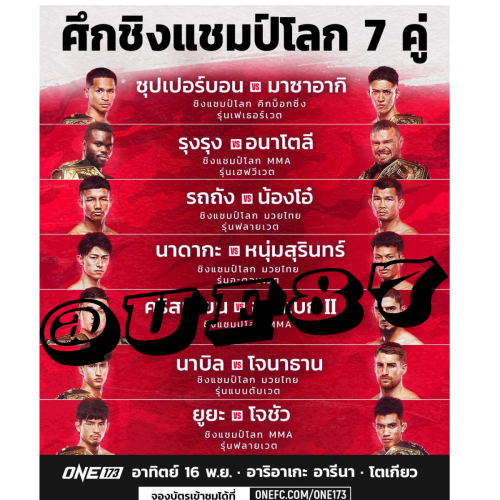 เว็บ แทงมวย ที่เปิดให้แทงมวยวัน One Championship แบบสดๆ ครบทุกคู่ แทงได้ทุกคู่ ราคาเริ่มต้นที่ 10 บาทต่อคู่ ไม่ว่าคุณจะเป็นแฟนมวย แทงยกต่อยก เสมอ ไล่ลง ไม่คิดเงิน สเต็ปมวยไม่ตาย สเต็ปมวย ผสมกันได้ 1 -10 คู่ แอดมินบริการ ตลอด 24 ชม