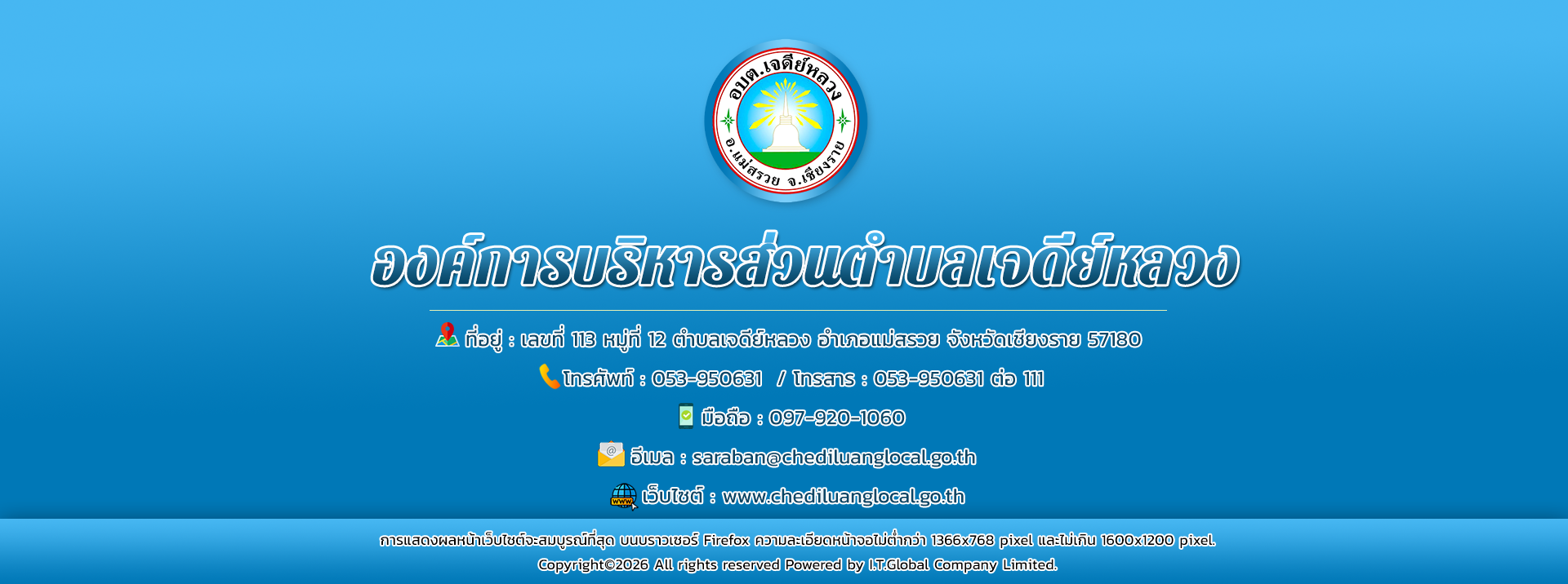 ยินดีต้อนรับเข้าสู่ องค์การบริหารส่วนตำบลเจดีย์หลวง ติดต่อสอบถาม : โทรศัพท์ : 053-950631 โทรศัพท์มือถือ : 097-920-1060 อีเมล์ : saraban@chediluanglocal.go.th โทรสาร (แฟกซ์) : 053-950631 ต่อ 111